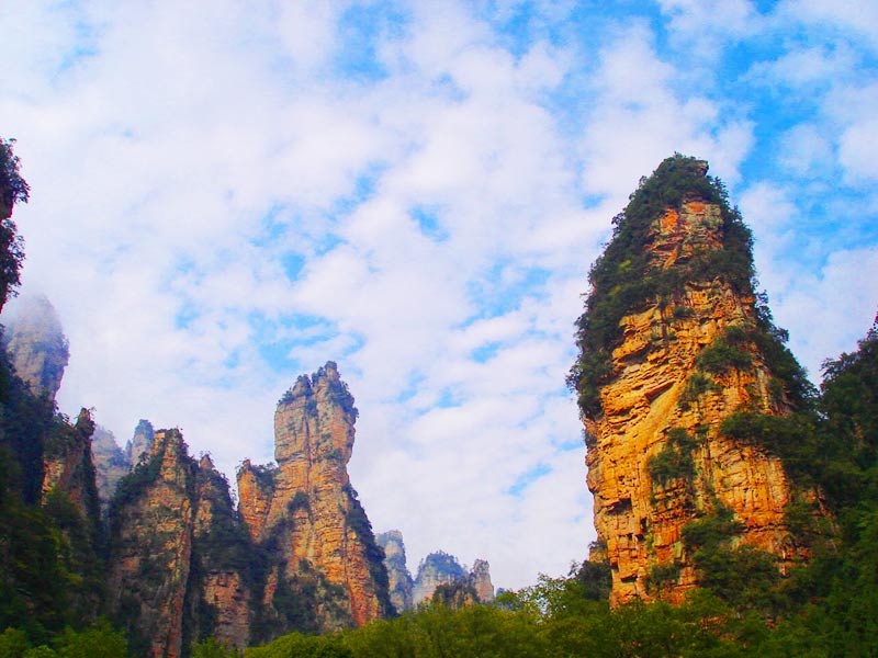 天門山國家森林公園四面絕壁,雄偉壯麗。保存著完整的原始次生林,植物資源豐富,有世界罕見的高山珙桐群落。天門山文化底蘊(yùn)深厚,留有大量贊詠天門山的詩詞,更有眾多神聞傳說,被譽(yù)為“張家界之魂”。山頂天門山寺自唐朝建成以來香火鼎盛,寺外有七級浮屠,掩映于青枝綠葉中,古雅幽清。善男信女入寺拜佛,撞鐘響徹天際,擊鼓震動山岳,香煙裊裊如云。明萬歷年間南岳僧在此傳經(jīng)授戒,從此聞名遐邇,朝山拜佛者達(dá)周邊四郡十余縣,信士遍及湘西北,天門山因此成為 “湘西第一神山”。天門山終年云霧繚繞,云海景象變化無窮。山間溶丘、石芽廣布,奇石秀木及珍禽異獸繁多,更有飛瀑流泉噴涌而出。天門山兼峰、石、泉、溪、云、林于一體,集雄、奇、秀、險、幽于一身,被譽(yù)為空中原始花園。天門洞、天縫渡仙、五指山、將軍石等是有名的峰林景觀,還有神秘的千佛洞等待你的探奇;山間的韓家溝則是富蘊(yùn)滿族風(fēng)情的村落——這里久居的幾十戶滿族農(nóng)家至今仍完好保留著其在語言、飲食、衣著、居住以及婚慶殯葬等方面的滿族風(fēng)俗,是難得的民俗文化旅游地。