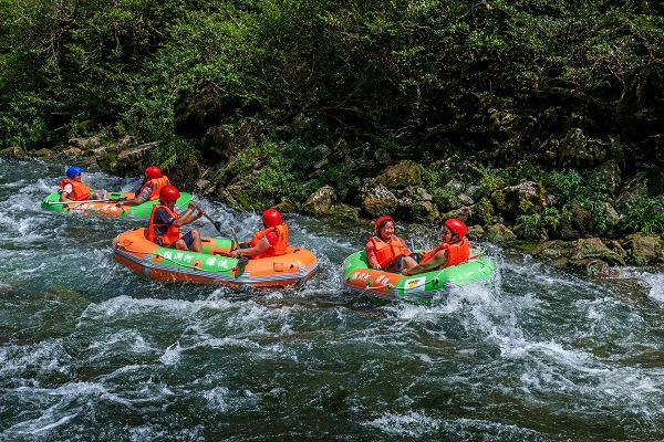 猛洞河漂流,起點哈妮宮距王村約40公里,行車1小時,終點牛路河距王村30分鐘的車程,漂流水路長17公里,漂流兩個半小時。從哈妮宮放舟而下,一路是古老的河道,絕壁百里,怪石嶙峋,灘奇水異,兩岸蒼翠的林木,云霧繚繞,飛瀑流泉與溶巖峰林交相輝映。拐一百五十五個彎,在一百三十三個灘潭中穿梭而行,迂回流連,馳魂奔魄,心曠神怡。