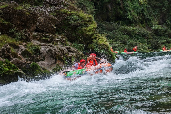 猛洞河水量豐富,河流坡降大,水急灘多浪奇,高大的峭壁直插水面,兩岸并相靠攏,形成幽深的峽谷景觀。沿河兩岸古木蒼天,蒼翠欲滴,奇石錯落,流泉飛瀑隨處可見,下游一路水碧山青,風(fēng)光秀麗,野猴成群,溶洞奇特。猛洞河天下第一漂項目位于猛洞河支流,全長47公里,最精彩處位于哈妮宮至牛路河段,長約17公里。該景區(qū)兩岸多為原始次森林,蔥蔥郁郁,水流湍急,碧綠清亮,有十里絕壁,十里瀑泉,十里畫卷,十里洞天的美譽(yù)。其中有急流險灘108處,大小瀑布20處。漂流,穿急流,越險灘,闖狹谷,捕激浪,有驚無險,回味無窮。特別是哈妮宮、三角巖、雞籠門、遇仙峽(捏土)、閻王灘、落水坑、夢思峽、鯉魚剖肚、三大炮等景點,無不令人叫絕觀止。