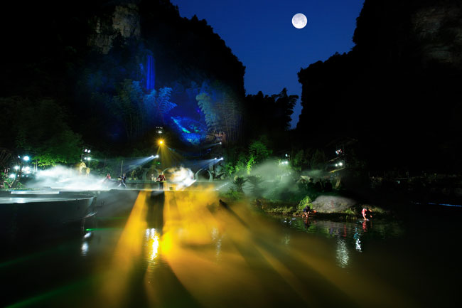 The Ancient Mystical Legend of Zhangjiajie 《武陵魂•梯瑪神歌》是一場記述土家族起源、演變、戰(zhàn)爭、生產(chǎn)生活等內(nèi)容的大型立體山水實(shí)景演出,揉合了音樂、舞蹈、文學(xué)等多種藝術(shù)形式,如幻如夢的舞美燈光,搖曳生姿的原生態(tài)歌舞……濃縮了土家族數(shù)千年的發(fā)展歷史,400多名演員以自然淳樸的表演充分的展示了土家的民族文化特征,給游客帶來了耳目一新的感受。一場視聽的饕餮盛宴,一曲驚天地、泣鬼神的曠世古歌,給人山水文化光影視聽的享受。【出品:張家界梯瑪神歌文化傳播有限公司】