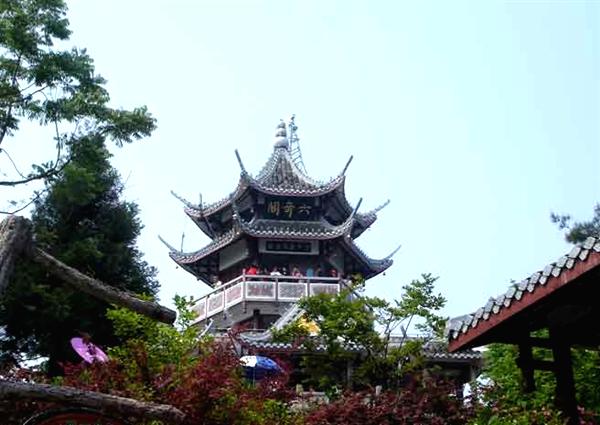 六奇閣位于張家界森林公園黃石寨項的人工建筑。因張家界國家森林公園”山奇、水奇、云奇、石奇.樹奇以及珍禽異獸之奇”而得名。閣分3層,黃瓦蓋頂,飛檐翹角,畫梁彩棟,回廊石欄。登閣憑眺,滿目佳景。閣柱楹聯(lián)日:“翠鬟煙籠,綠樹云封.昔日曾遮半個面:麗質天生,畫圖省識,今朝始醉四方人!庇忠宦(lián)云“名動全球,到此實堪三擊掌:勢拔五岳,歸來不用再看山!遍w內設有土家風情歌舞樓.竟日絲竹弦管,清音繞梁。閣基嵌有《張家界國家森林公園記》全文碑刻。1995年9月8日.全國政協(xié)主席李瑞環(huán)登閣賞景。
