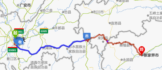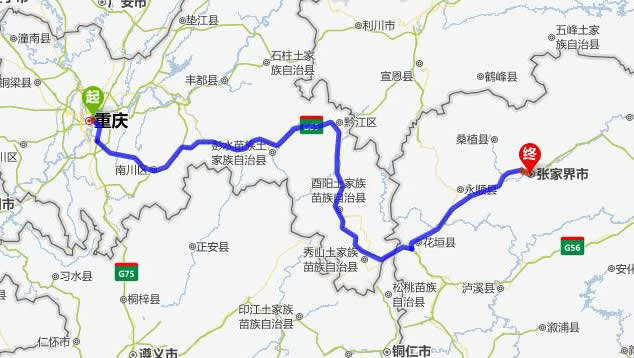 左右,沿途經過重慶——南川區(qū)——武隆縣——彭水——黔江——咸豐——來鳳——桑植縣——張家界。