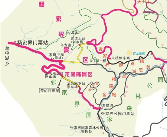 龍泉瀑布-楊家界風(fēng)光 3、中湖門(mén)票站進(jìn) 中湖門(mén)票站——索道下站八里坡停車(chē)場(chǎng):(乘車(chē))15分鐘 楊家界索道運(yùn)行時(shí)間5分鐘 索道上站——?jiǎng)⒓议芡\?chē)場(chǎng):(步行)5分鐘 劉家檐停車(chē)場(chǎng)——袁家界天橋停車(chē)場(chǎng)(乘車(chē))10分鐘 劉家檐停車(chē)場(chǎng)——天子山停車(chē)場(chǎng)(乘車(chē))25分鐘
