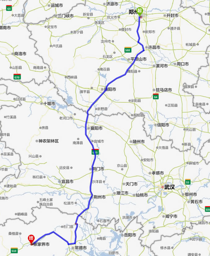 鄭州去張家界自駕車自助游線路圖全程高速):
