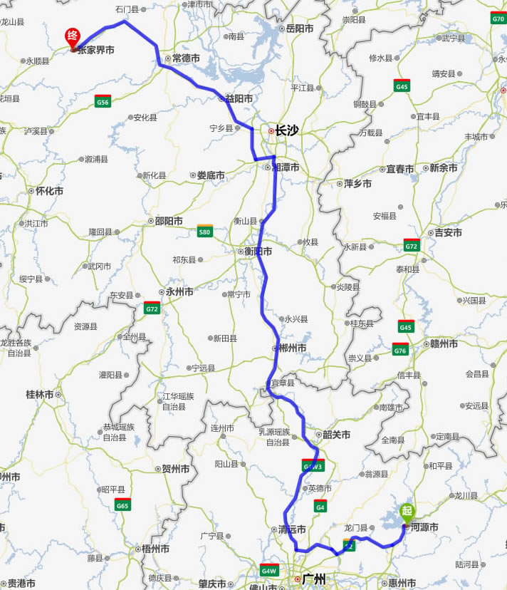 河源去張家界自駕車自助游線路圖全程高速):