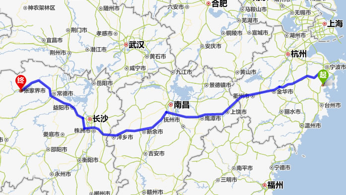 左右,沿途經過寧海——新昌縣——金華市——衢州市——上饒市——鷹潭市——新余市——宜春市——萍鄉(xiāng)市——株洲市——湘潭市——寧鄉(xiāng)縣——益陽市——常德市——慈利縣——張家界。
