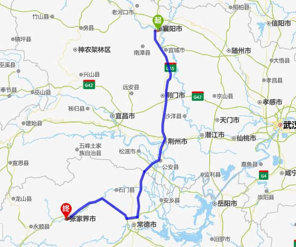 左右,沿途經過襄陽——荊門市——荊州市——常德(也可以走國道經澧縣、石門縣)——慈利——張家界。