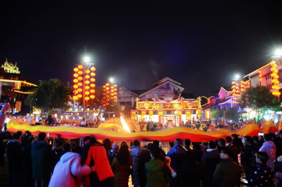 火龍出場,街區(qū)狂舞;盤龍點睛,眾人祈福。12月21日,農(nóng)歷冬至,當天夜晚在旅游勝地張家界武陵源區(qū)溪布老街擺手堂廣場啟動的 “武陵腔調(diào):趕火趕戲趕大年”活動儀式上,一條全身似火的長龍在近百名土家兒女的舞動下 “閃亮”登場,格外耀眼。據(jù)了解,這條長龍身有香味,全長108米,是目前世界最長的香火龍。